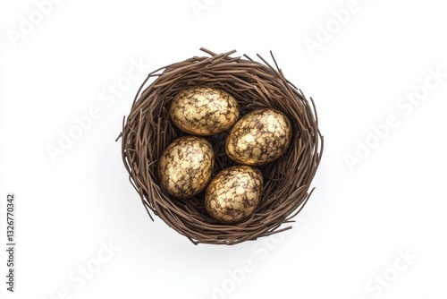 © Meyka, Fototapeta premium Golden Eggs in Bird Nest on White Background (1)