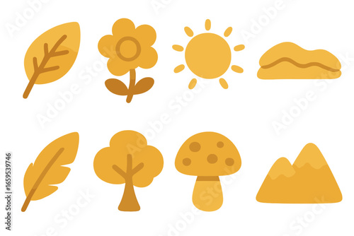 Fototapeta premium Golden Elements Grid. Flat vector mini-illustrations golden nature elements in colors children's illustrations: golden leaf,