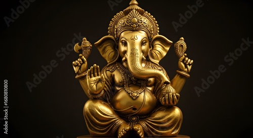 © Laodefardin, Fototapeta premium Golden Elephant God Sitting with Ornate Headdress on Dark Background