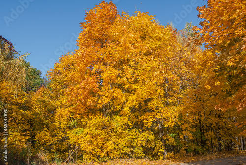 © Nick Taurus, Fototapeta premium Golden fall. Norway Maple (Acer platanoides) in deciduous forest, Central Russia