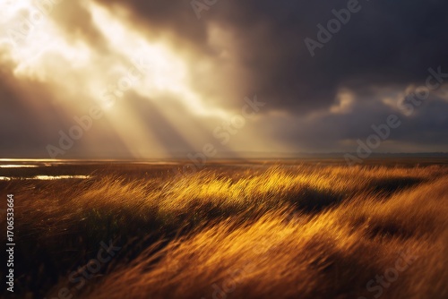 Obraz premium Golden field landscape sunlight rays scenic nature photography countryside...