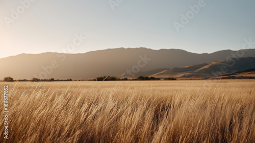 © GrayFrog, Fototapeta premium Golden field of tall grass glows in warm sunset light with soft rolling hills and distant mountains.