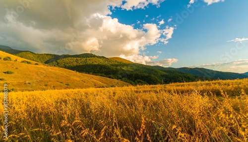 © Wiwik, Obraz premium Golden field stretches towards a backdrop of rolling hills and lush forests, illuminated by a vibrant golden light, under a partly cloudy sky.