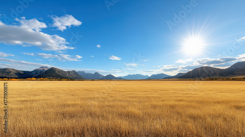 © siraphol, Obraz premium Golden field under bright sun with distant mountains and blue sky creates serene landscape