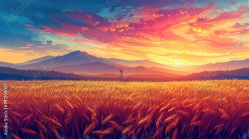 © Hammam, Fototapeta premium Golden Field with a Sunset Over Silhouetted Mountains