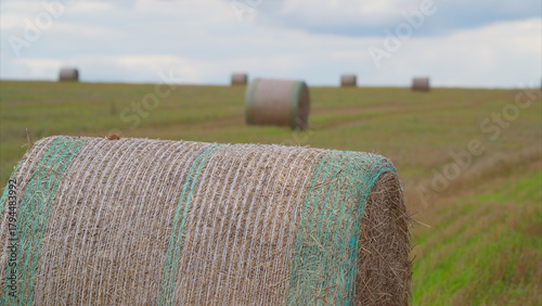 Obraz premium Golden Fields adorned with Hay Bales set against the backdrop of a Cloudy...