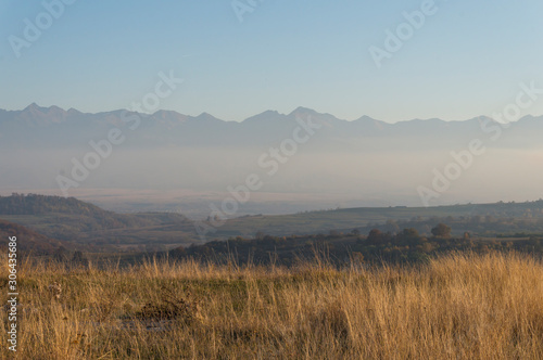 © Gabriel Teleptean, Fototapeta premium Golden fields in Carpathian Mountains. Mountains and barley cut fields in the horizon, golden hour photo-shoot. Golden fall panorama
