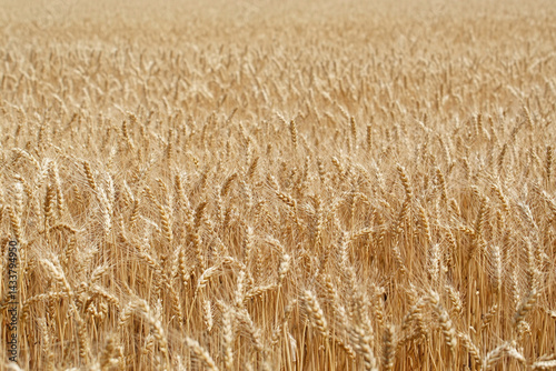 Fototapeta premium Golden fields of ripe wheat sway gently under a clear blue sky during a sunny afternoon