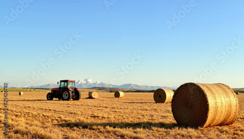Fototapeta premium Golden fields stretch under a clear blue sky as a tractor rolls among hay bales in a tranquil rural setting