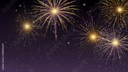 © Laiba, Fototapeta premium Golden fireworks burst against a dark purple night sky.