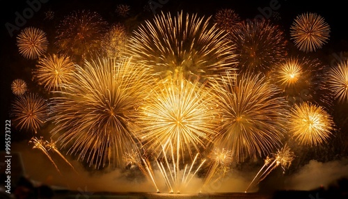 Naklejka premium Golden Fireworks Lighting Up the Night Sky Over a River