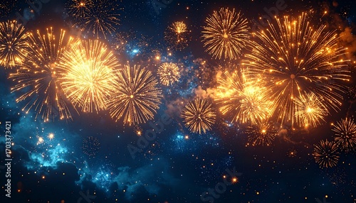 © Imam, Fototapeta premium Golden Fireworks on Dark Night Sky
