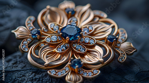 © KALEYA, Obraz premium Golden Flower Brooch with Blue Gemstones Realistic Image