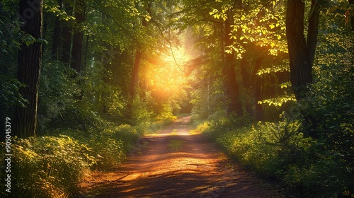 Naklejka premium Golden Forest Path: A sun-drenched path through a dense, vibrant forest,...