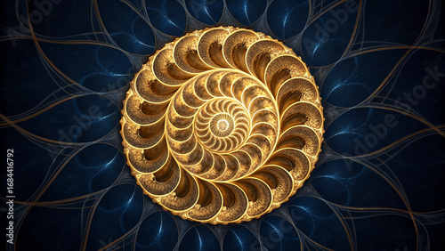 Obraz premium Golden Fractal Spiral Pattern on Dark Blue Textured Background geometric...
