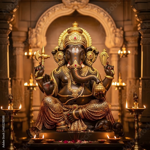 © Shree Ganesha, Fototapeta premium Golden Ganesha Idol in Temple with Divine Lighting for Ganesh Chaturthi Worship