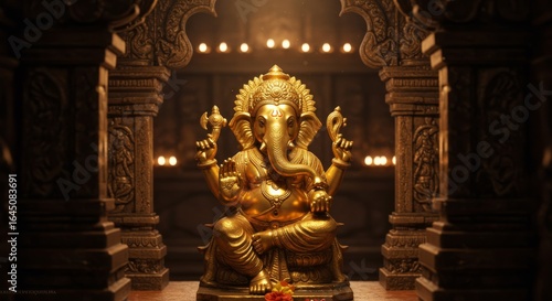 © onehourhappiness, Fototapeta premium Golden Ganesha Statue in Temple Setting