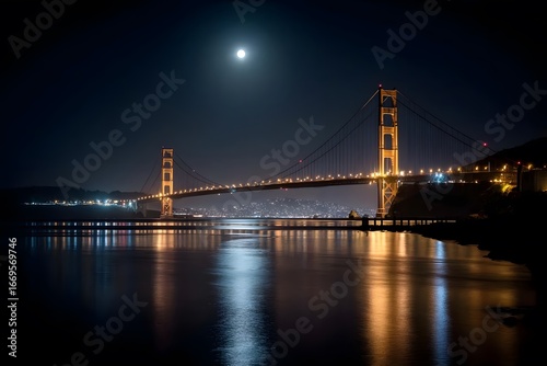 © YiXiong, Fototapeta premium Golden Gate Bridge at night, illuminated, full moon above.