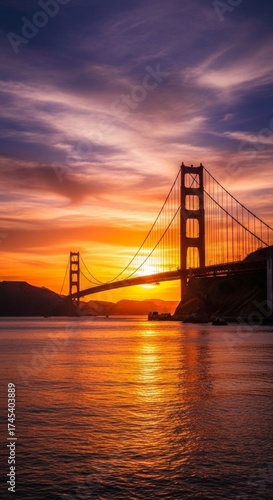 Fototapeta premium Golden gate bridge at sunset with vibrant sky and ocean reflections