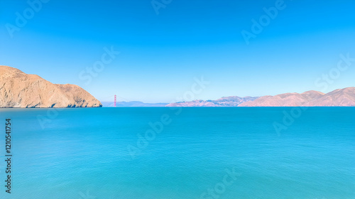 © Nadiyah, Fototapeta premium Golden Gate Bridge distant view, calm ocean, clear sky, coastal mountains, travel postcard