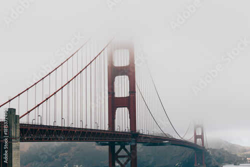 © Sakan, Obraz premium Golden Gate Bridge emerging through layers of soft morning fog.