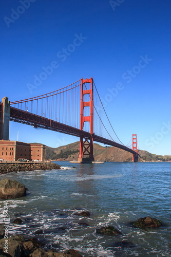 Naklejka premium Golden Gate bridge from the San Francisco side. View of Fort Mason on the left and rocks in the foreground. A blue sky is in the background. It is a vertical image.