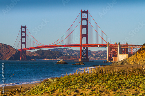 Fototapeta premium Golden Gate Bridge mit Bakers Beach am Abend