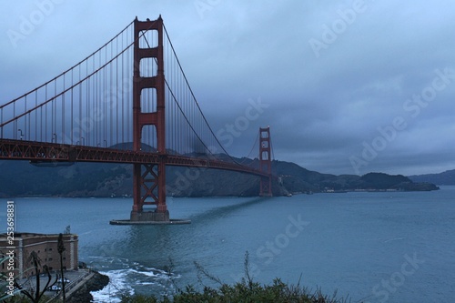 © Andrew, Fototapeta premium Golden gate bridge on dark, cloudy day with hills in background