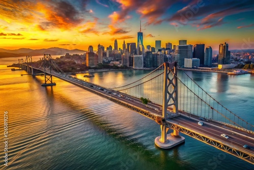 © Man888, Fototapeta premium Golden Gate Bridge & San Francisco Skyline Aerial Backlit Drone Shot 8K