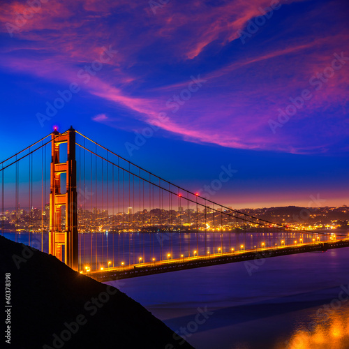 Fototapeta premium Golden Gate Bridge San Francisco sunset through cables