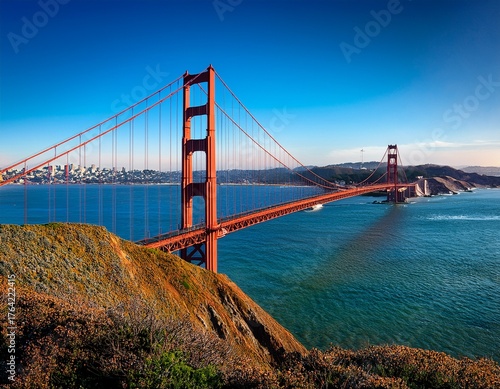 © Murad, Naklejka premium Golden Gate Bridge Views: A Captivating Perspective from Marin Headlands, San Francisco with Bright Blue Skies