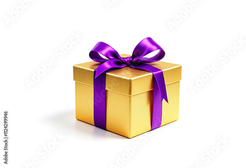 © Valentin, Obraz premium Golden gift box with purple ribbon isolated on a white background