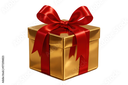 Fototapeta premium Golden gift box with red ribbon and bow on transparent background, symbolizing celebration and surprise