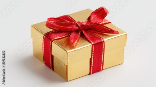 Obraz premium Golden gift box with red ribbon bow, symbolizing luxury and celebration