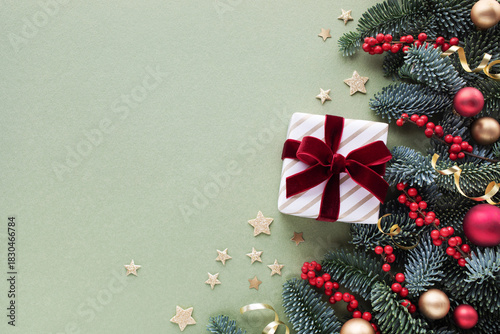 © juliasudnitskaya, Obraz premium Golden gift or present box with velvet red ribbon with festive decoration on green background for Christmas or New Year greeting card