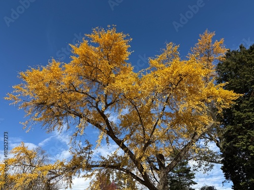 © tacomentai, Fototapeta premium Golden Ginkgo Tree Against Clear Blue Sky in Autumn