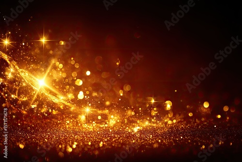 © Tanha, Naklejka premium Golden glitter and sparkling lights on a dark background