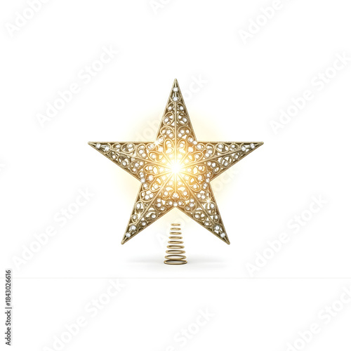 © Fahim, Obraz premium Golden Glitter Christmas Tree Topper Star Sparkling Isolated on White