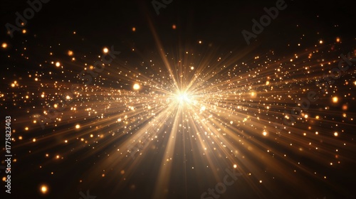 Obraz premium Golden Glitter Explosion with Rays of Light on Dark Background for Festive Celebrations