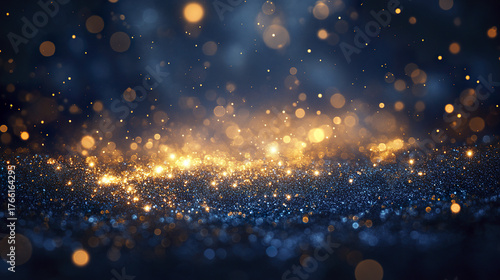 Obraz premium Golden glitter particles sparkle on dark blue background with bokeh light effect, creating magical and festive atmosphere full of glowing bright spots and shimmering texture