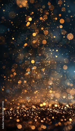 © AlexCaelus, Obraz premium Golden glittering bokeh lights in front of a dark, blurry background, creating a festive and magical atmosphere.