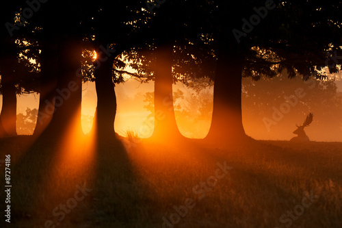 © bridgephotography, Obraz premium Golden glow. A fallow deer buck silhouetted in the morning mist.