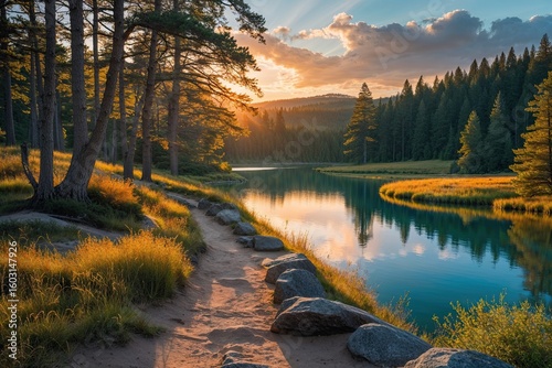 Obraz premium Golden Glow Hike: Elevated Views Along Enchanting Forest Trails and a Tranquil Lagoon