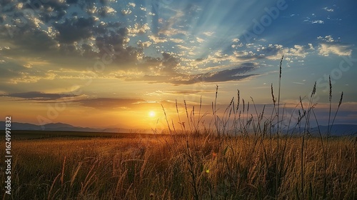 © peng, Fototapeta premium Golden Glow of Celebration: New Year Decorations Meet Grassland Sunset in Breathtaking Images As the sun dips below the horizon, painting the grassland in hues of amber and crimson, vibrant New Year d