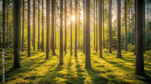 © M2A, Fototapeta premium Golden Glow of Sunset Illuminating Tall Trees in a Quiet Forest Space