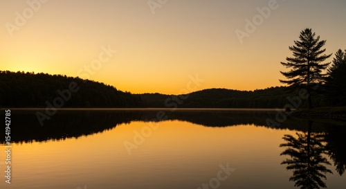 © syukri, Obraz premium Golden Glow Over the Lake Nature Reflections at Dusk