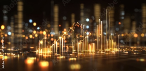 Fototapeta premium Golden glowing cityscape with rising graph, symbolizing growth and success.