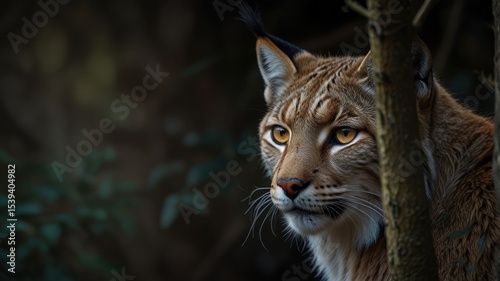 © Gilang, Fototapeta premium Golden Glowing Eyes of a Lynx Hidden in the Shadows
