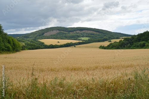 Fototapeta premium Golden grain fields stretch across rolling hills under a moody sky in late...