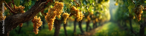 Obraz premium Golden grapes hang heavy on the vine in a sun-drenched vineyard-style...